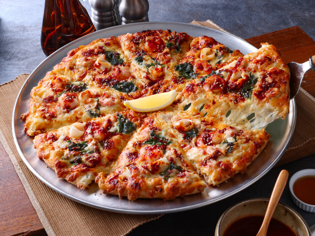 エビ・カニ・イカの“魚介ゴールデントリオ”に特製の甘辛ヤンニョムソースを合わせた贅沢なシーフードピザ。